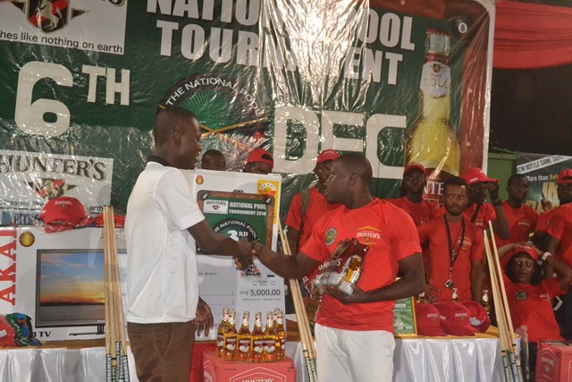 Runner-up Daniel Promise took home a flat screen TV, 2 cartons of Hunter’s Gold drinks, a certificate of qualification and a Hunter’s National Pool Tournament branded cu stick as his prize.