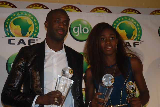 WINNERS ALL : Asisat Oshoala (right) clutching the 2014 Glo/CAF Award for African Woman Footballer of the Year and the African Youth Player of the Year Awards and Four-time winner of the Glo/CAF African Footballer of the Year Award, Yaya Toure (left) moments after receiving the awards at the Glo/CAF Awards at Eko Hotel, Lagos, Nigeria