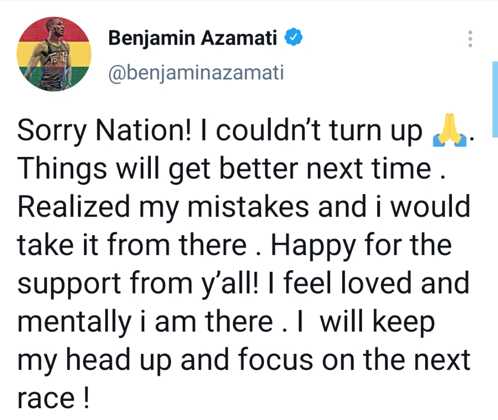 Taking to his Twitter after the race, the young sprinter has apologised to Ghanaians while vowing to continue working hard to do better in future events.
