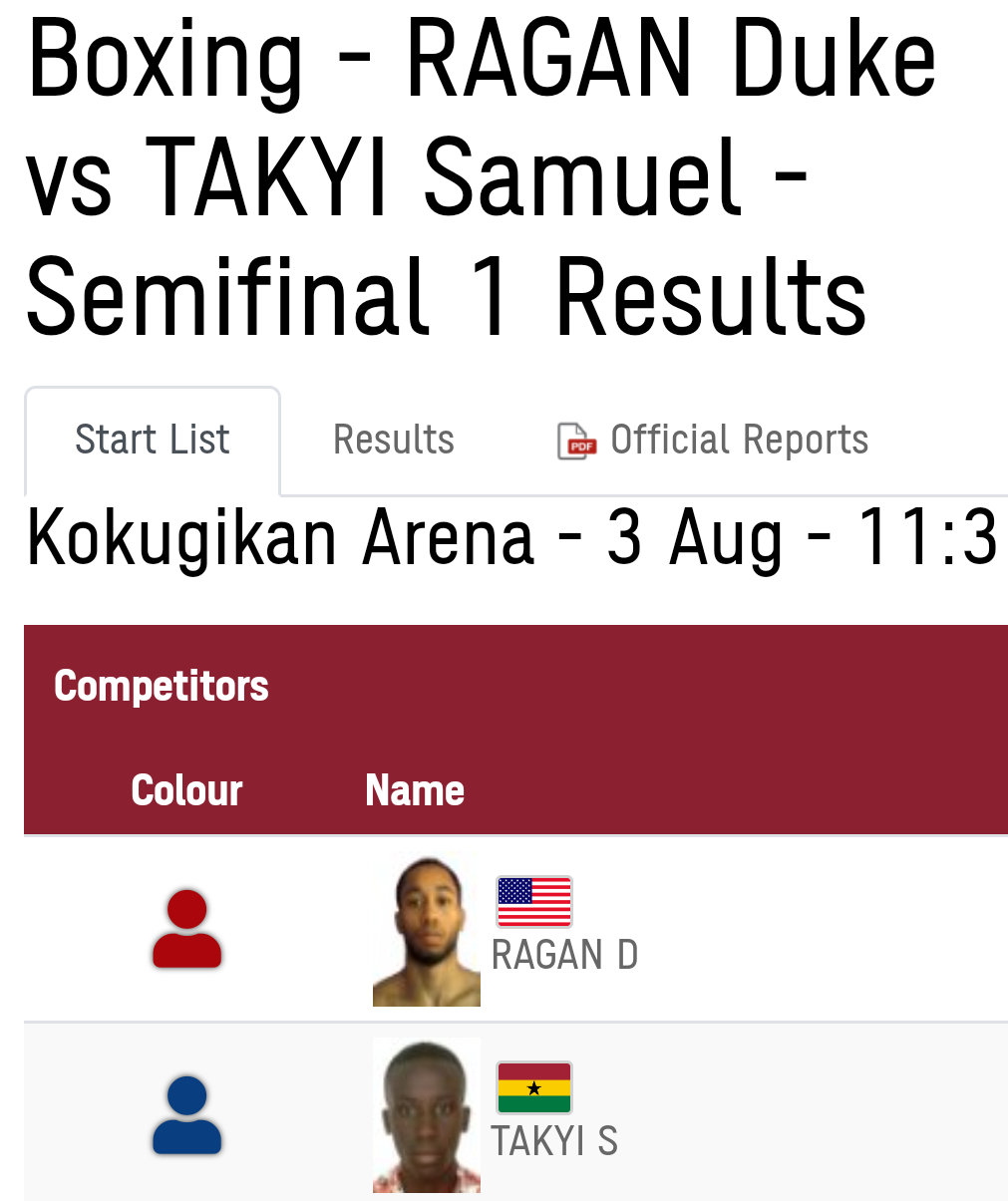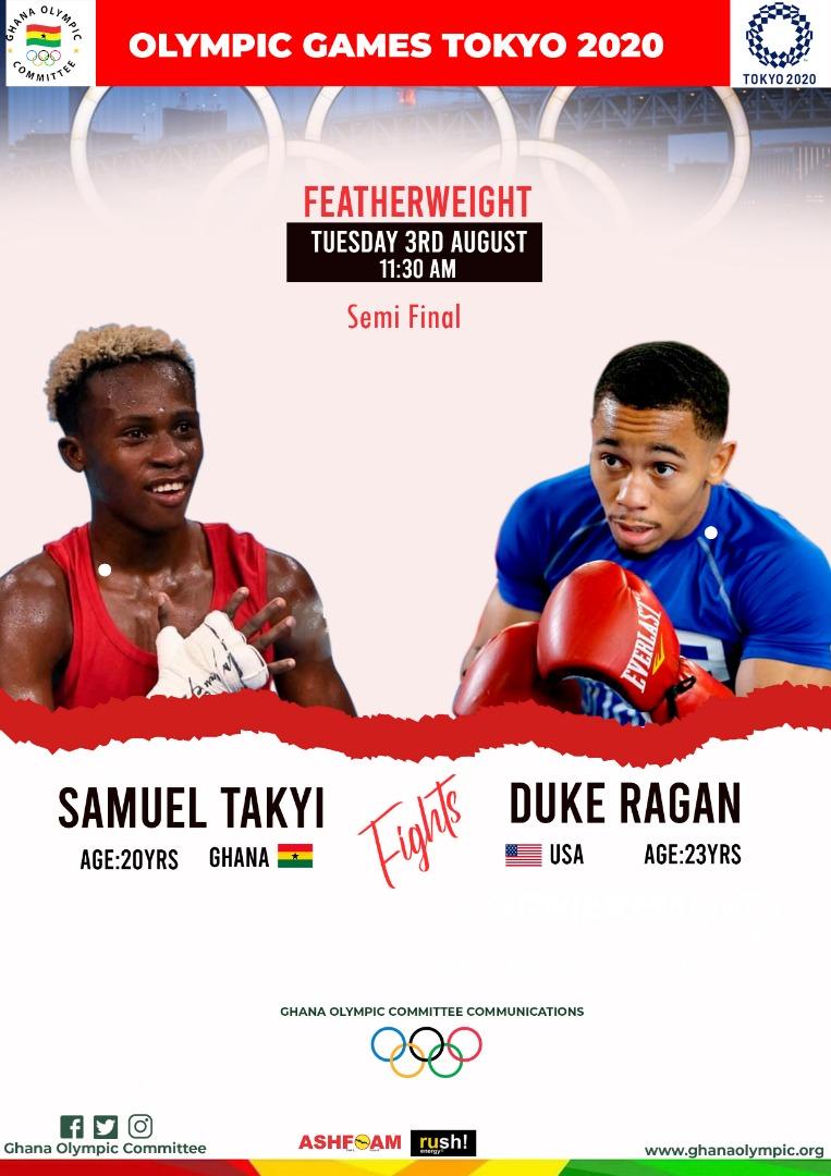 From all indications, Takyi v Ragan bout will be a closely contested affair. Victory for Takyi will see him becoming the second Ghanaian boxer in the final of the Olympic Games boxing event after Clement Quartey who powered his way to the final in the 1960 Rome Olympics, losing to Bohumil Nemecek of Czechoslavakia.