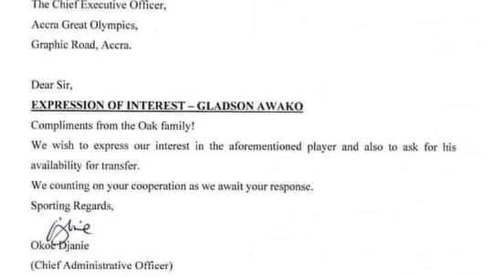 Accra Hearts of Oak have officially written to city rivals Accra Great Olympics for the services of star player Gladson Awako.
