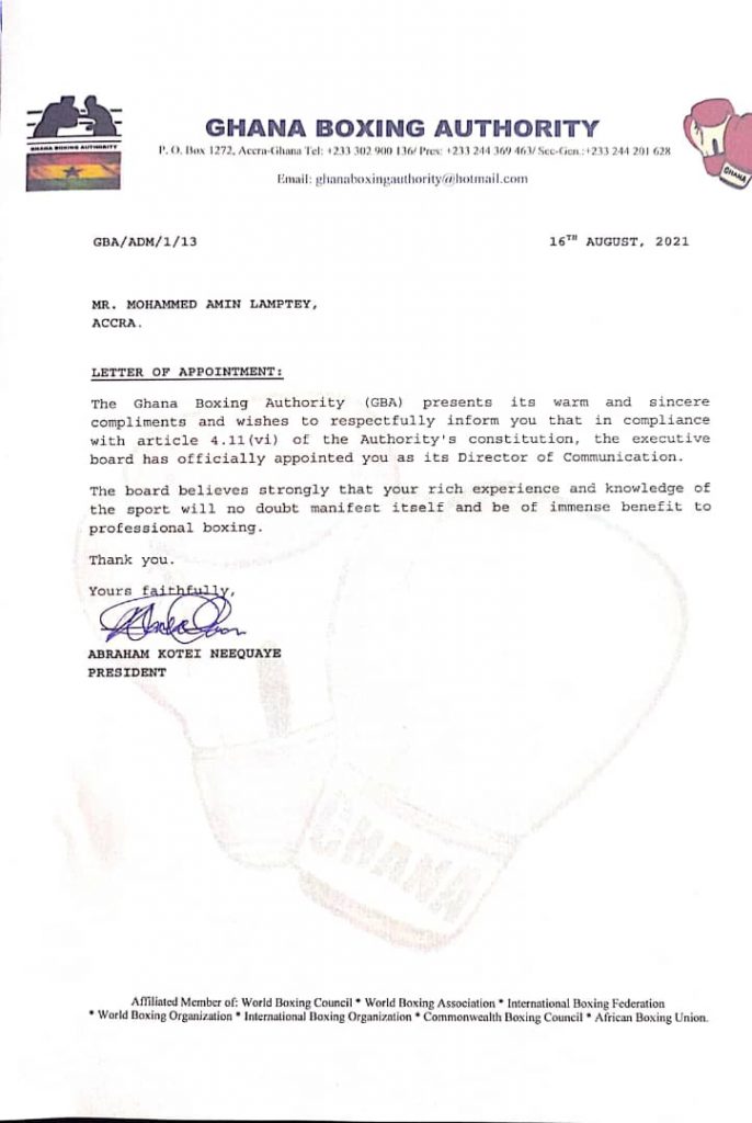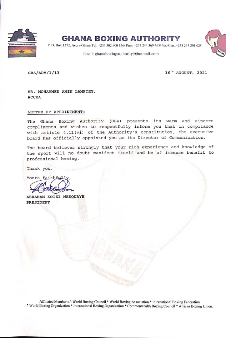 “The Ghana Boxing Authority wishes to respectfully inform you that in compliance with article 4.11(vi) of the Authority’s constitution, the executive board has officially appointed you as it’s Director of Communication,” stated the letter signed by new GBA President Abraham Kotei Neequaye.
