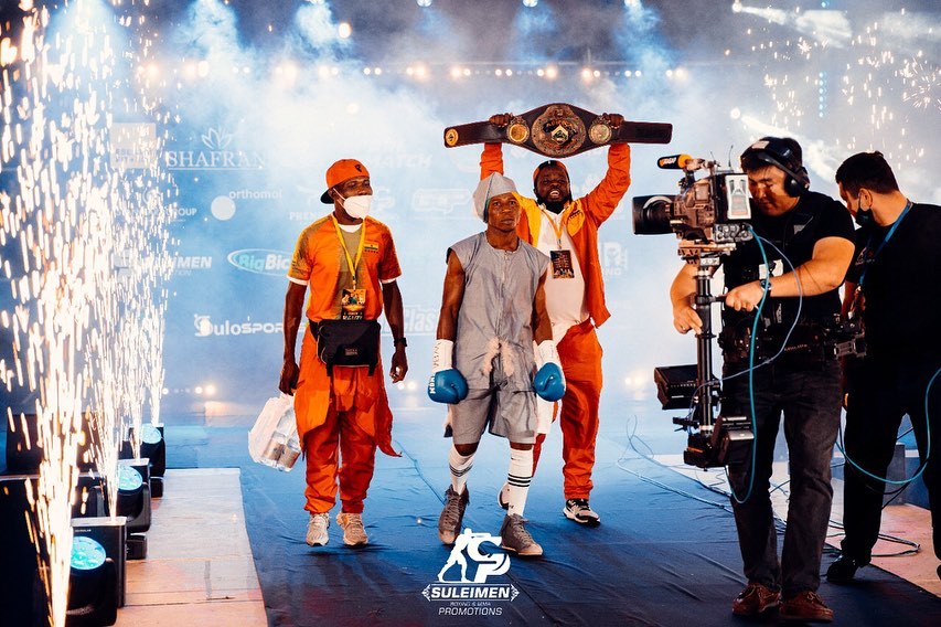Sackey makes ring entry for the fight with his coach, Osumanu Brew and manager, Evans Bernie-Johnson