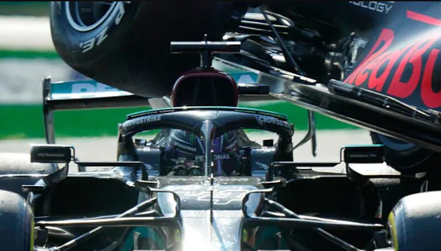 But Verstappen’s car, pushed onto the sausage kerb at the Turn One chicane, ended up with its back wheel rolling over the top of his rival’s Mercedes, narrowly missing Hamilton’s head.