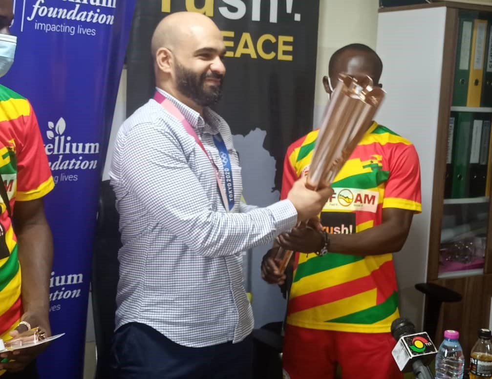 The skipper of Team Ghana, Cpl. Suleimanu Tetteh presented the Olympic Touch, while Samuel Takyi also presented his Olympic bronze medal and a symbolic Olympic Touch after receiving a citation from Mr. Ajami.
