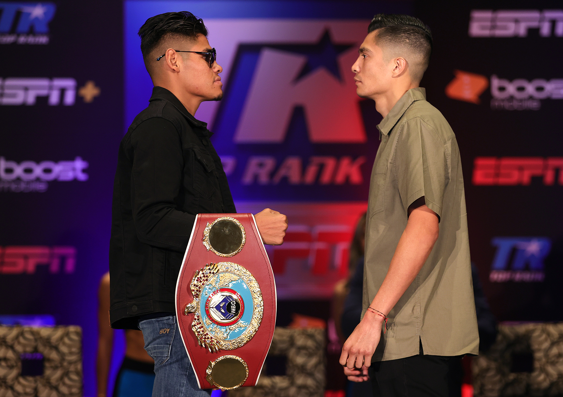SAN DIEGO, CALIFORNIA – OCTOBER 13: Emanuel Navarrete (L) and Joet Gonzalez (R) face-off during the press conference for the WBO featherweight championship at Omni San Diego Hotel on October 13, 2021 in San Diego. (Photo by Mikey Williams/Top Rank Inc via Getty Images)