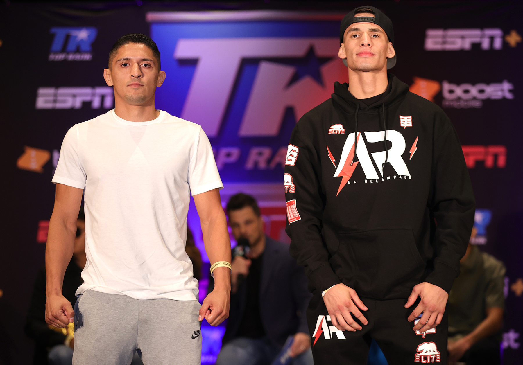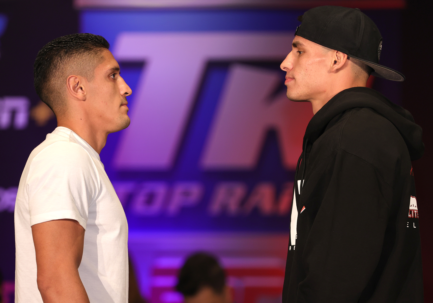 SAN DIEGO, CALIFORNIA – OCTOBER 13: Giovani Santillan (L) and Angel Ruiz (R) face-off during the press conference at Omni San Diego Hotel on October 13, 2021 in San Diego. (Photo by Mikey Williams/Top Rank Inc via Getty Images)
