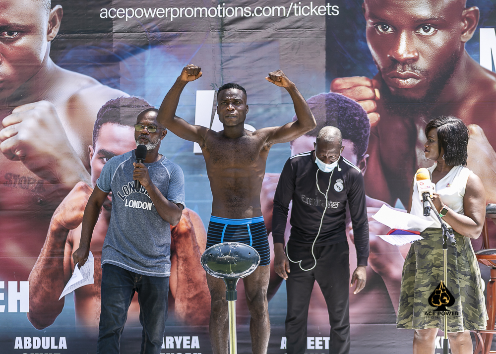 ACE Power Promotions stable fighter, Emmanuel Baidoo weighed 153 lbsĀ for his pro debut against Henry Mensah (0-2, 0 KOs) who tilted the scales at 154.1 lbs for their super welterweight contest billed for 6 rounds whilst another debutant, Samuel Martei Laryea came in at 122.5 lbs for a super bantamweight contest over 6 rounds versus Jonathan Mensah, also on debut.