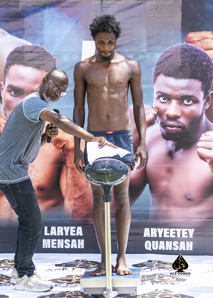 Former Ghana super flyweight champion, Emmanuel Quartey AKA Akufo-Addo (23-3, 20 KOs) weighed 131.7 lbs for the super featherweight 6-round contest against Billy Quaye (7-33, 7 KOs) who made131 lbs whilst the pride of Ashaiman, Abraham Afful (8-3-1, 8 KOs) tilted the scales 142.5 lbs for his welterweight 8-rounder against Francis Aryee (0-1) who weighed 141.6 lbs.