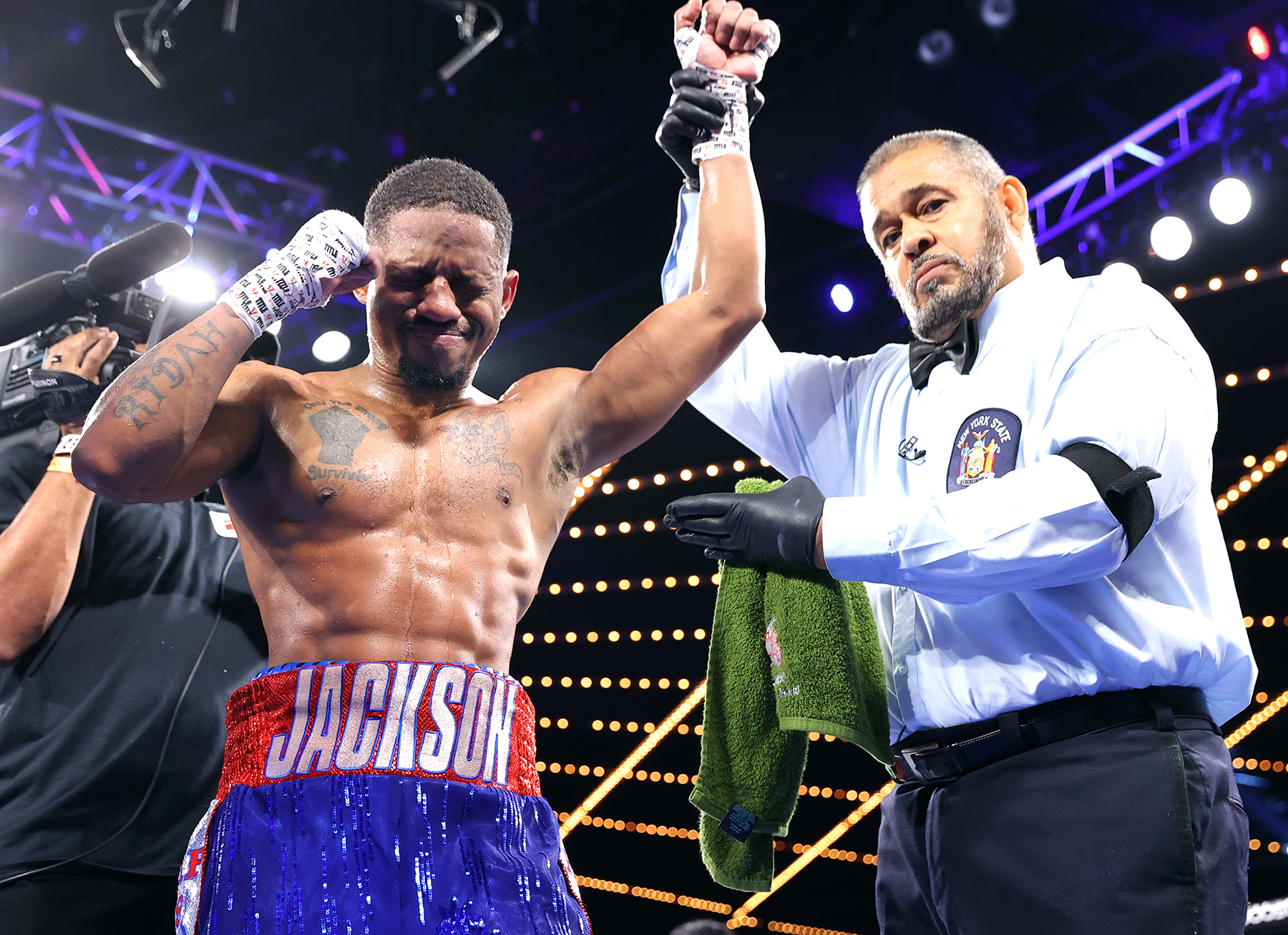 NEW YORK, NEW YORK – OCTOBER 30: Carlos Jackson is victorious as he defeats Jonathan Guzman at The Hulu Theater at Madison Square Garden on October 30, 2021 in New York City.(Photo by Mikey Williams/Top Rank Inc via Getty Images)