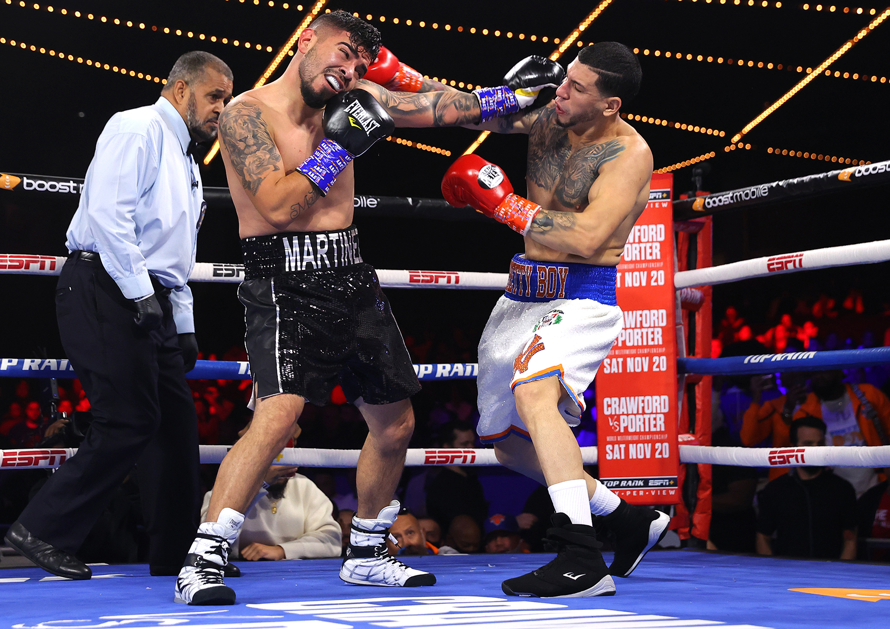 NEW YORK, NEW YORK – OCTOBER 30: Alejandro Martinez (L) and Pablo Valdez (R) exchange punches during their fight at The Hulu Theater at Madison Square Garden on October 30, 2021 in New York City.(Photo by Mikey Williams/Top Rank Inc via Getty Images)
