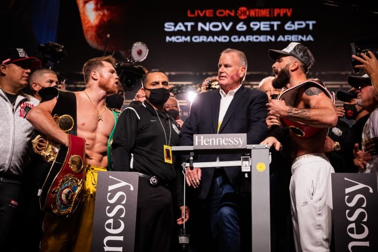 Canelo tipped the scale at the division limit of 168 pounds. Photo by Amanda Westcott/SHOWTIME