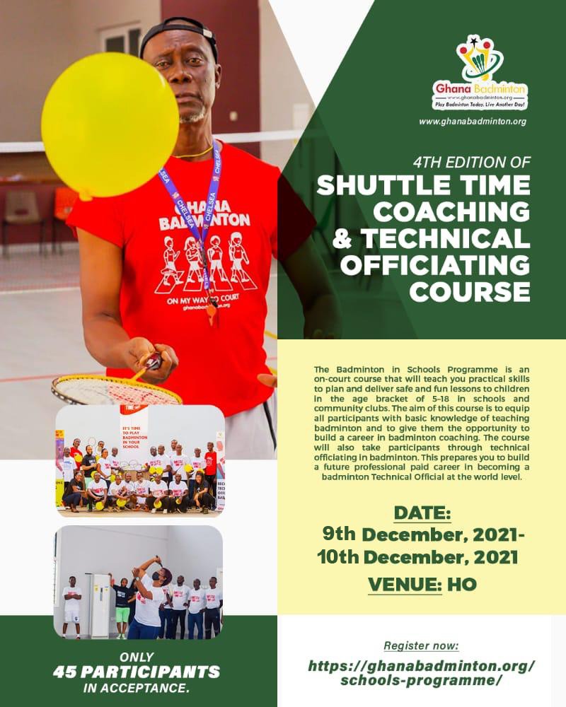 This is a special course for the year for a discounted fee GHC 199.00 only for early birds. The Shuttle Time Coach Course and Technical Officiating Course is where the attendee becomes trained to deliver Shuttle Time to Children in a school or club setting. This is a practical coaching and technical course, helping new and experienced coaches and technical officials to plan and deliver fun badminton lessons to pupils aged 5-18 years old.