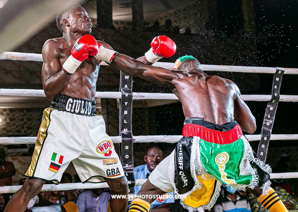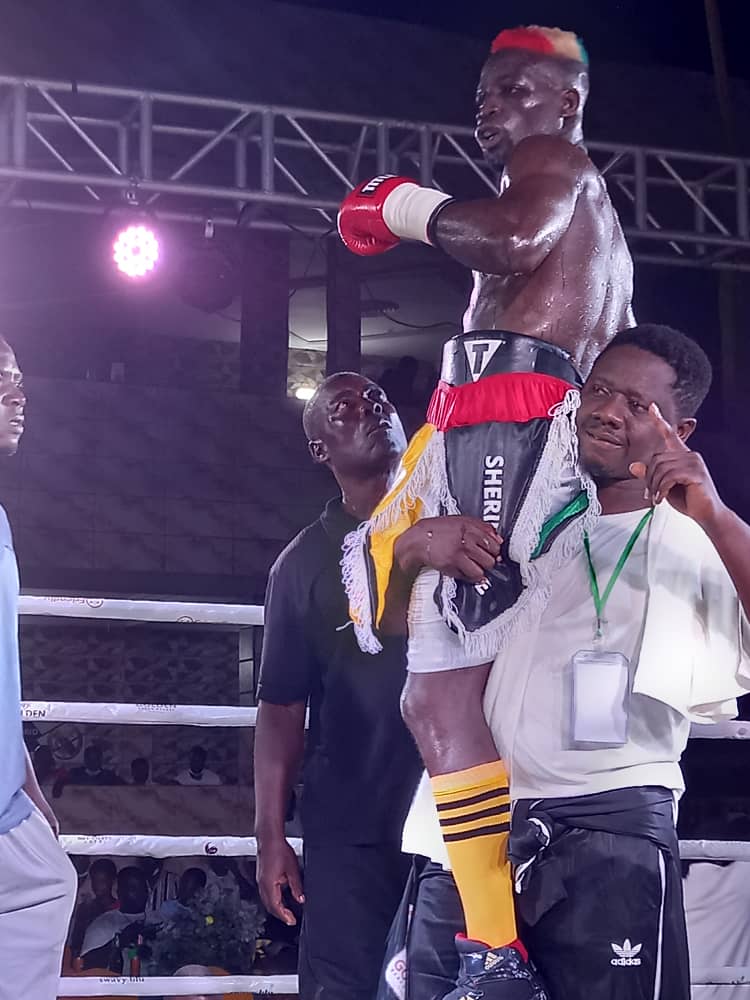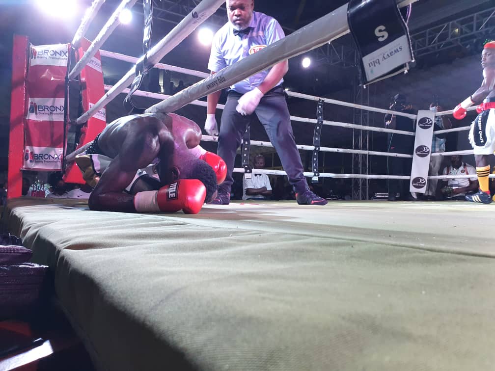 Amos managed to once again beat the count of Referee Owoo after going down early in the third stanza courtesy a left uppercut backed with a right jab but as soon as the centre official instructed them to continue with the fight, Quaye once again pounced, what appeared to be a routine left jab to the body of Amos proved the undoing of the Tanzanian as he went down, clutching his tummy and shaking his head in a clear submission that he couldn’t continue no more and sat almost motionless as referee Owoo counted him out to hand Sheriff Quaye victory.