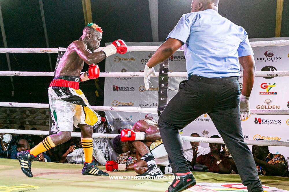 Round 3 however proved to be the coup de grace for a confidence surging Sheriff Quaye as he continued to pummel Amos more than ever before, so much the Tanzanian soon yielded to the effects of  the body shots the Ghanaian kept raining down his stomach chest and head.