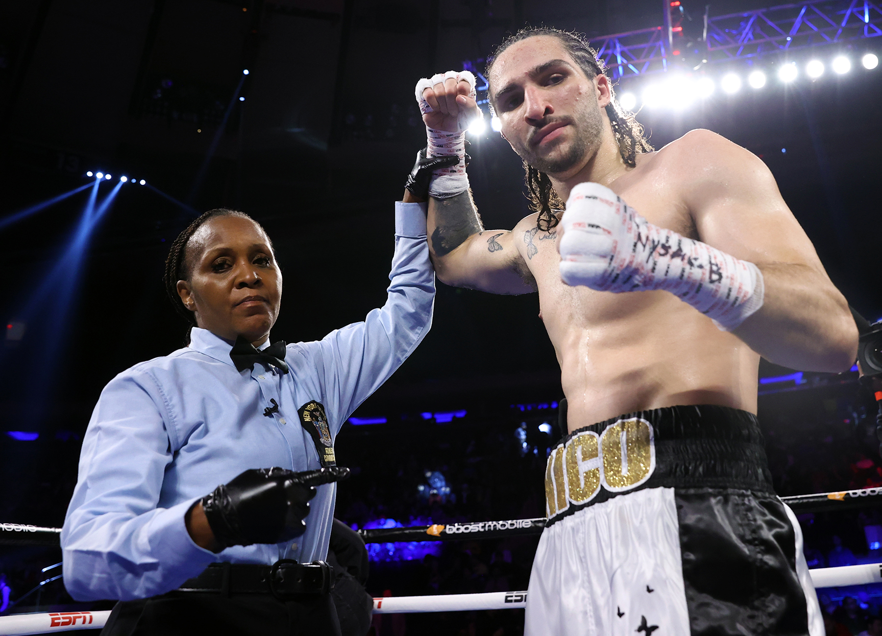 NEW YORK, NEW YORK – DECEMBER 11: Nico Ali Walsh is victorious as he defeats Reyes Sanchez during their middleweight fight at Madison Square Garden on December 11, 2021 in New York City. (Photo by Mikey Williams/Top Rank Inc via Getty Images)