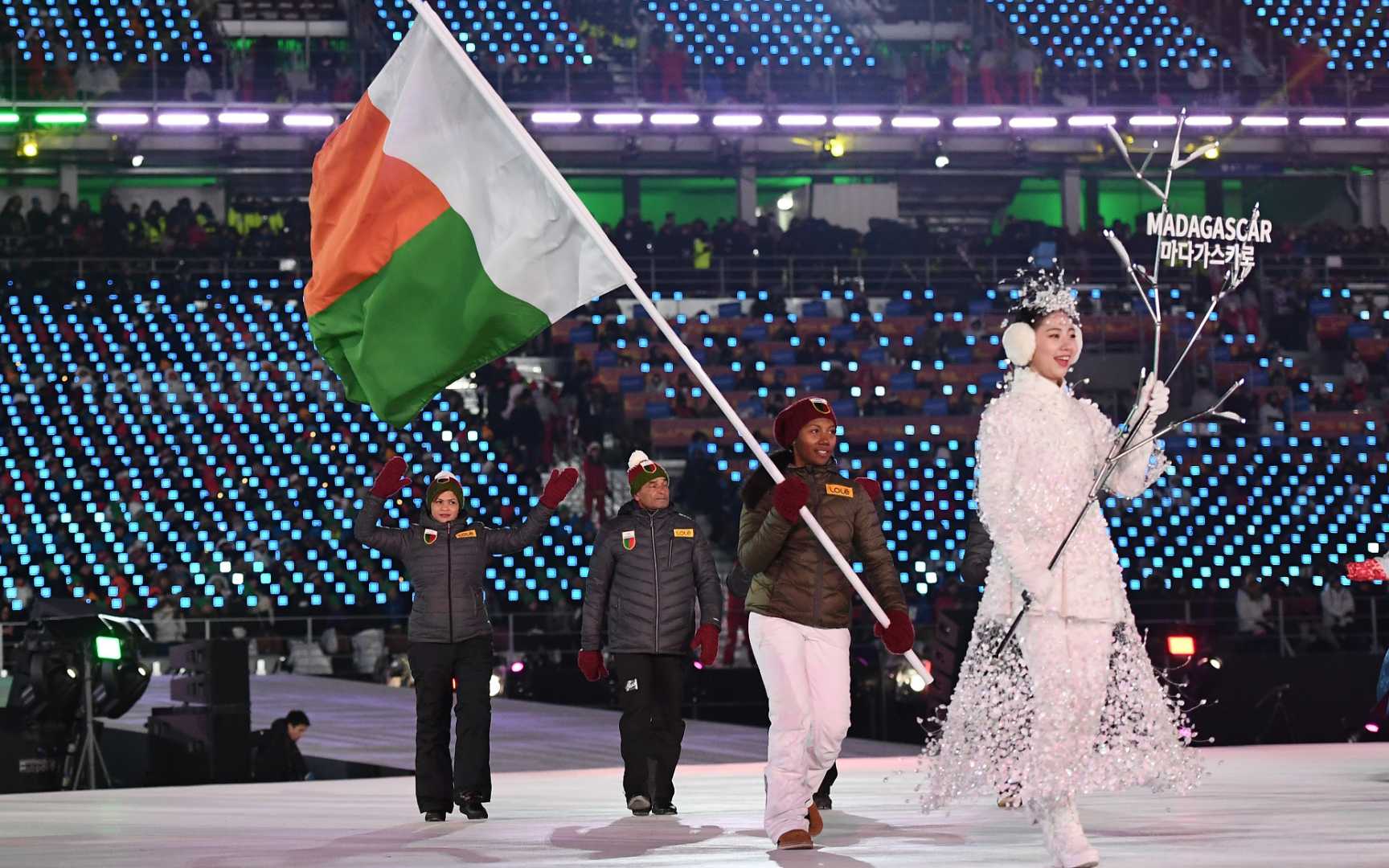 Alpine skier Mialitiana Clerc was Madagascar’s flag bearer during the Opening Ceremony of the PyeongChang 2018 Winter Olympic Games. (Photo by Quinn Rooney/Getty Images)