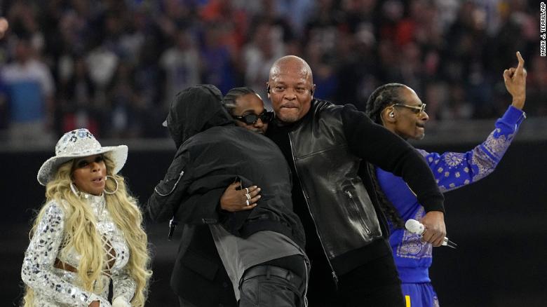 The “original gangsters” Snoop Dogg and Dr. Dre performed with Dre’s mentee Eminem, the Queen of R&B hip-hop Mary J. Blige, and rap star Kendrick Lamar.