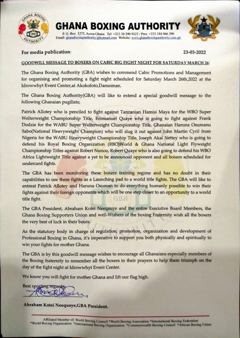 The Ghana Boxing Authority (GBA) have sent a goodwill message to boxers featuring on the Cabic Big Fight Night on Saturday at the Idrowght Events Centre, Dansoman, 26th March, 2022.