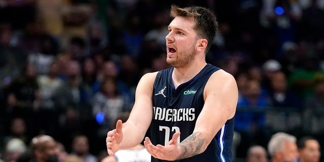 Dallas Mavericks guard Luka Doncic (77) reacts to a call during the second half against the Golden State Warriors in Game 3 of the NBA basketball playoffs Western Conference finals, Sunday, May 22, 2022, in Dallas. (AP Photo/Tony Gutierrez)