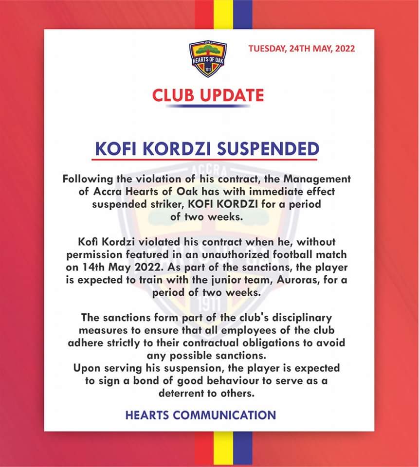 According to a statement released by the club, Kofi Kordzi has violated his contract and has been suspended for two weeks.