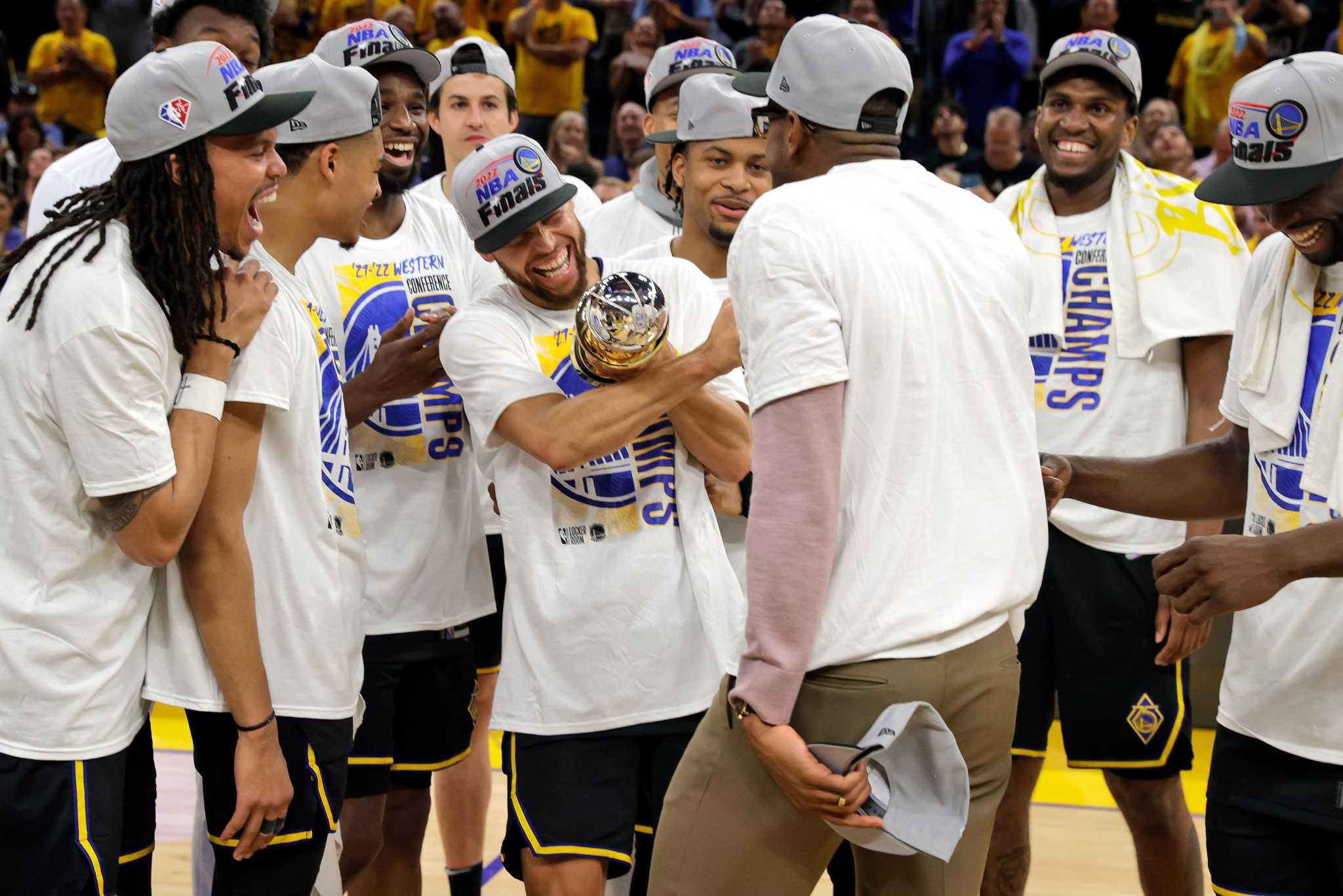 Curry smiled and laughed as he celebrated returning to the NBA Finals, which came with the first Magic Johnson Western Conference finals MVP trophy after the Warriors eliminated the Dallas Mavericks with their 120-110 win in Game 5 on Thursday night.
