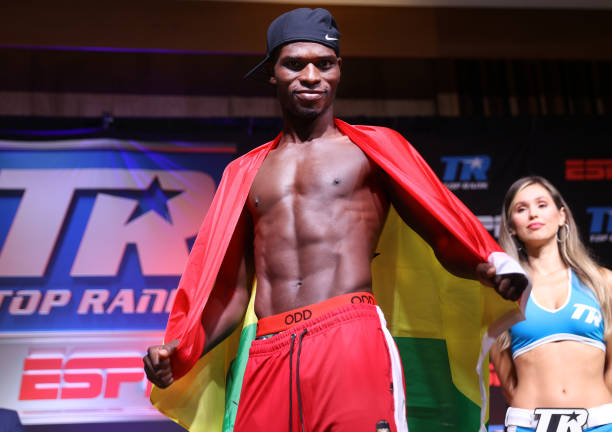 CATOOSA, OKLAHOMA – AUGUST 26: Richard Commey poses on the scale during the weigh in ahead of his junior welterweight fight with Jose Pedraza, at Hard Rock Hotel & Casino Tulsa on August 26, 2022 in Catoosa, Oklahoma. (Photo by Mikey Williams/Top Rank Inc via Getty Images)