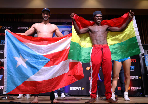 CATOOSA, OKLAHOMA - AUGUST 26: Richard Commey poses on the scale during the weigh in ahead of his junior welterweight fight with Jose Pedraza, at Hard Rock Hotel & Casino Tulsa on August 26, 2022 in Catoosa, Oklahoma. (Photo by Mikey Williams/Top Rank Inc via Getty Images)