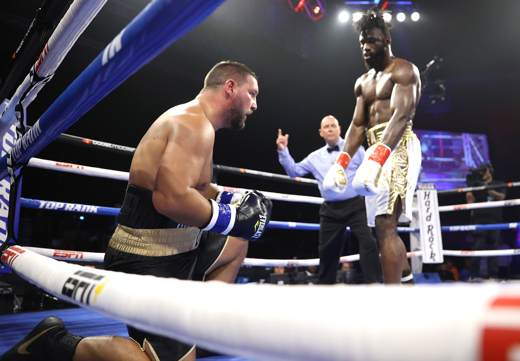 CATOOSA, OKLAHOMA – AUGUST 27: Efe Ajagba (R) knocks-down Jozsef Darmos (L) during their heavyweight fight at Hard Rock Hotel & Casino Tulsa on August 27, 2022 in Catoosa, Oklahoma. (Photo by Mikey Williams/Top Rank Inc via Getty Images)