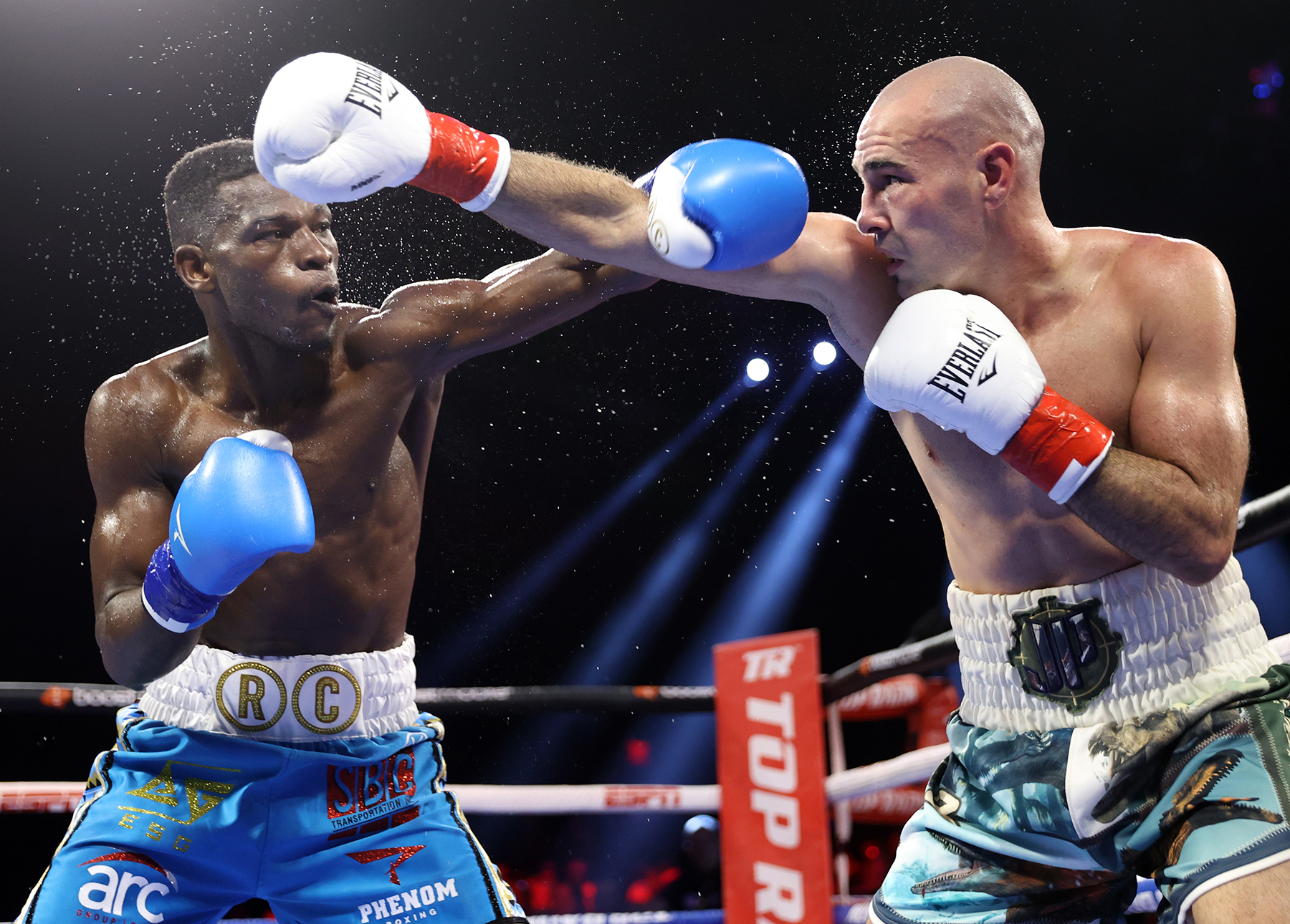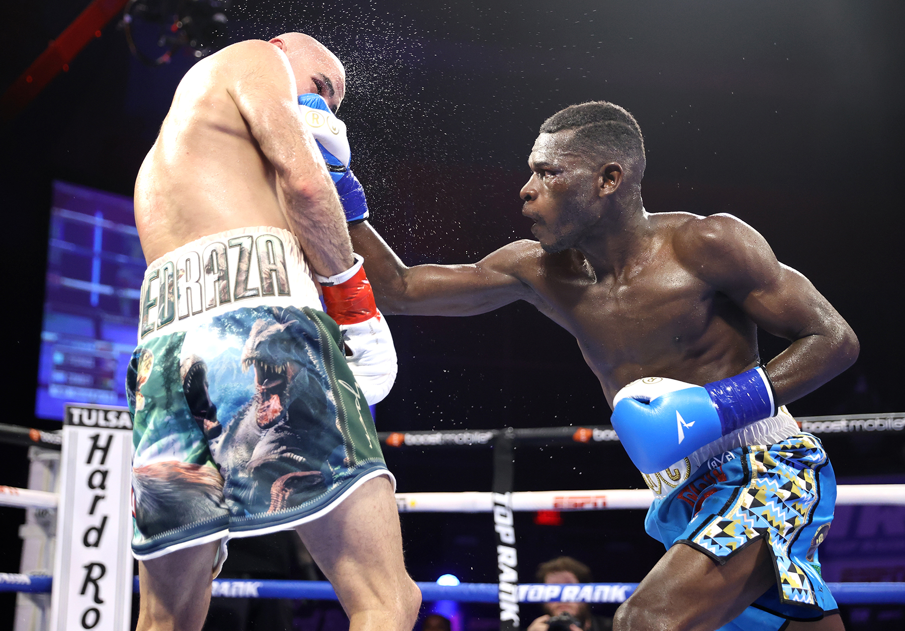 CATOOSA, OKLAHOMA – AUGUST 27: Richard Commey (L) and Jose Pedraza (R) exchange punches during their junior welterweight fight at Hard Rock Hotel & Casino Tulsa on August 27, 2022 in Catoosa, Oklahoma. (Photo by Mikey Williams/Top Rank Inc via Getty Images)