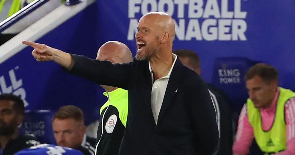 Manchester United’s Dutch manager Erik ten Hag (R) looks on during the English Premier League football match between Leicester City and Manchester United at King Power Stadium in Leicester, central England on September 1, 2022 (Photo by GEOFF CADDICK/AFP via Getty Images)