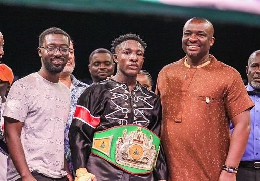 Michael Decardi-Nelson poses with Ghana Boxing Authority President, Abraham Kotei Neequaye (right) and Emmanuel Asamoah, Country Management of Ghana Binance, after being decorated with the title belt