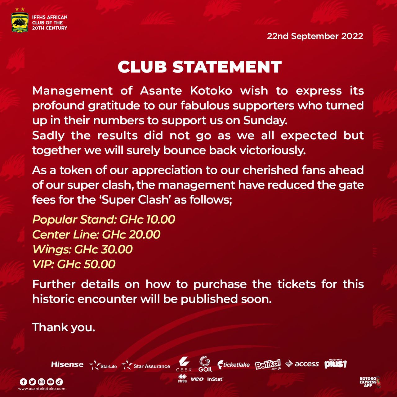 “Sadly the results did not go as we all expected but together we will surely bounce back victoriously. As a token of our appreciation to our cherished fans ahead of our super clash, the management have reduced the gate fees”.