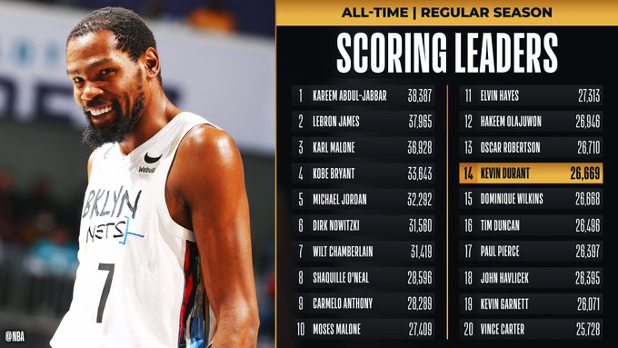 Having scored his 26,684 points in only 978 games to date, Durant is positioned to reach the next several spots well faster than their current inhabitants. Oscar Robertson (27,710 points in 1,040 games) is up next, soon followed by Hakeem Olajuwon (26,946; 1,238).
