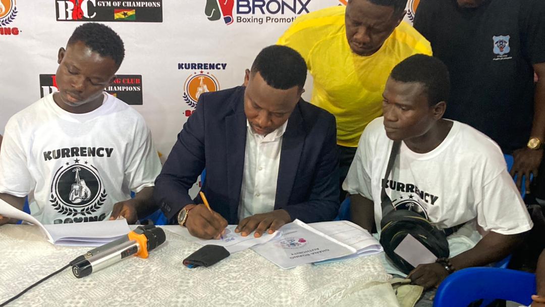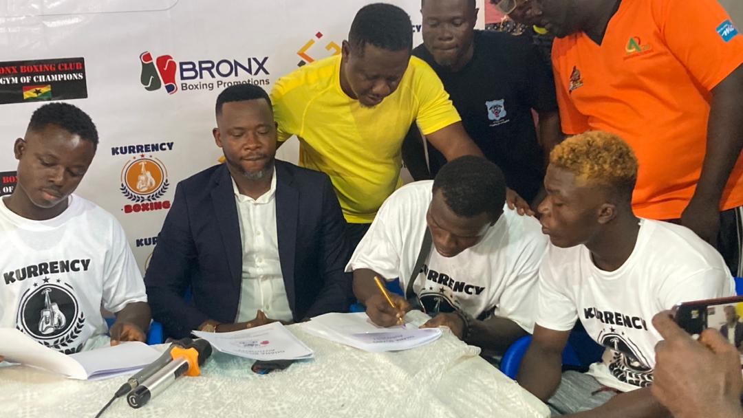 The elaborate and grandiose ceremony which took place at the Bronx Boxing Gym in Accra saw boxers: Daniel Quaye aka ‘High Tension’ (lightweight), Issifu Sulley (super featherweight) and Stephen Coffie (lightweight), all of who train at the Bronx Boxing Gym being signed to a three-year renewable contract.