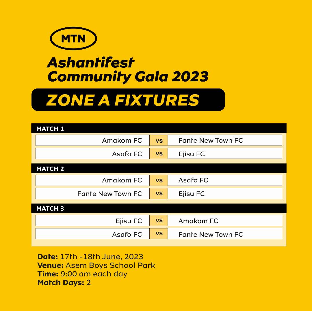 Amakom will face Fante New Town in the opening match of theĀ 2023 MTN Ashantifest Community Soccer tournament when Zone A kicks off the action this Saturday, June 17 at 9am at the Asem Boys School Park in Kumasi, the fixtures have revealed.