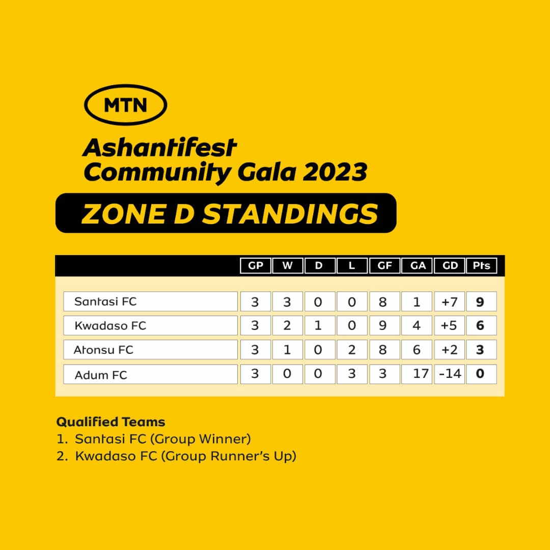 After routing Adum in their first match, Kwadaso went on to defeat Atonsu 2-1 in their second game on the double strike of Emmanuel Owusu Boakye to seal qualification even before their loss to Santasi in the final game.