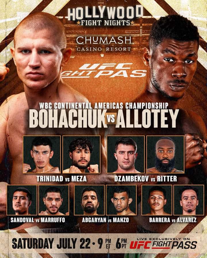 Unbeaten junior middleweight contender Serhii Bohachuk will face Patrick Allotey. The 10-round bout will headline a 360 Boxing Promotions card that will stream live on UFC Fight Pass at 6 p.m.