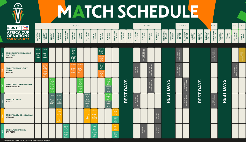 The Confederation of African Football (CAF) have released the official match schedule for the TotalEnergies CAF Africa Cup of Nations Cote d’Ivoire 2023 following the successful draw held in Abidjan last week.