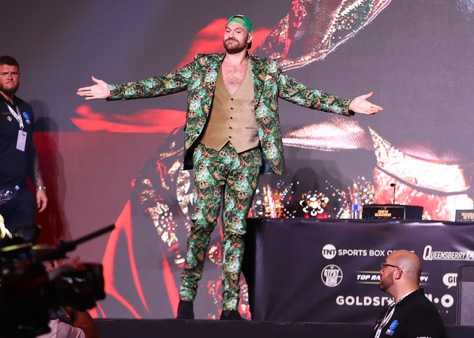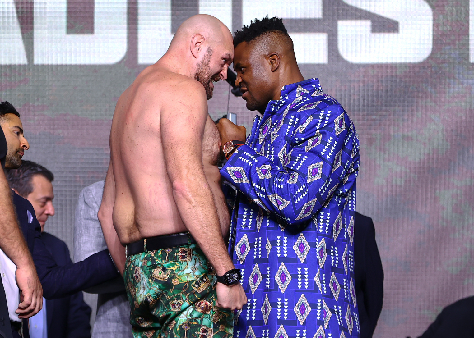 “Francis Ngannou is a big man. I see he’s taken a bit of advice from me with the clothes he’s wearing. He’s looking a bit snazzy. They say the finest form of flattery is imitation. And he’s got his suit on with no shirt on, and I started that! So, he’s imitating. But, there’s one thing I say, and it’s that many will imitate, but no one will ever replicate. Because there’s only one Gypsy King.