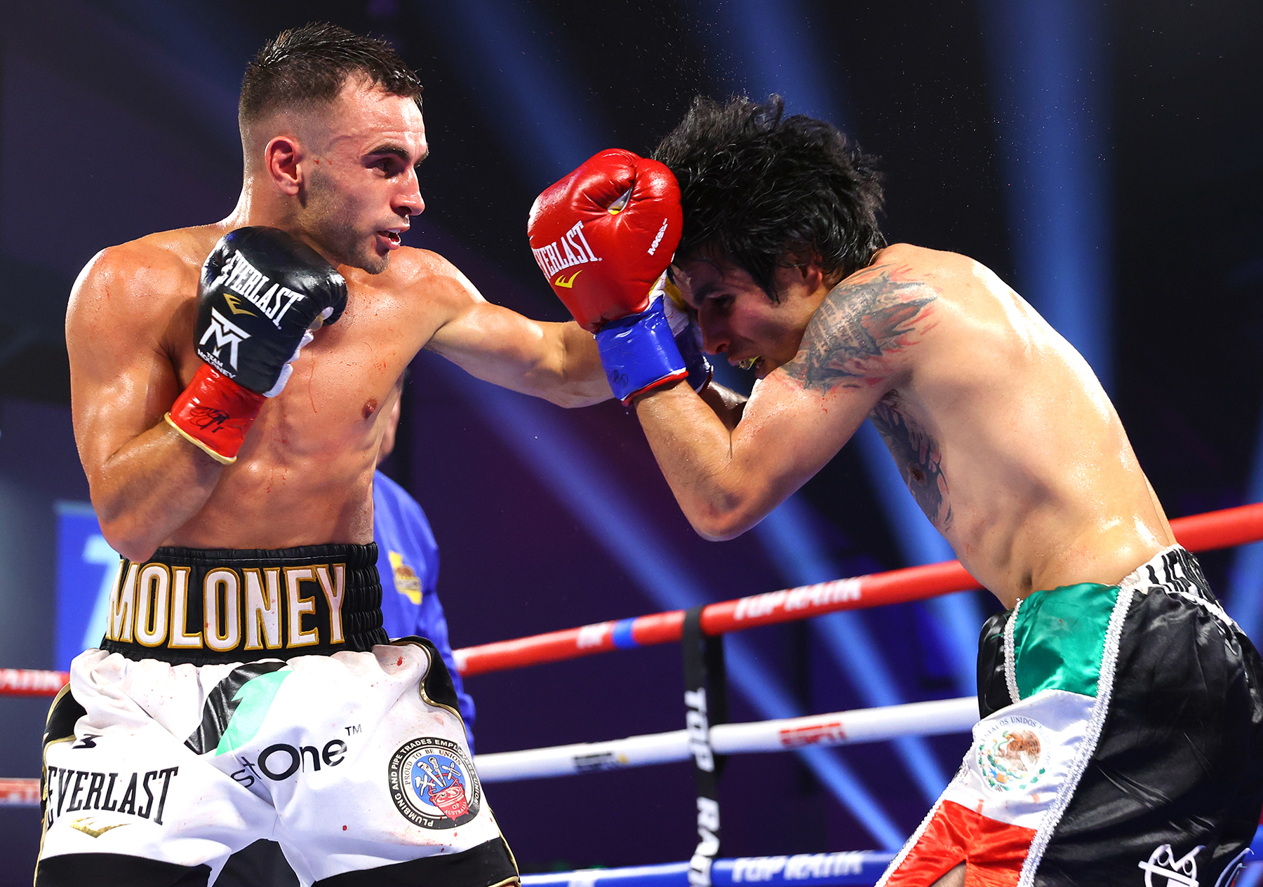 COSTA MESA, CALIFORNIA – APRIL 09: Andrew Moloney (L) and Gilberto Mendoza (R) exchange punches during their junior bantamweight fight at The Hangar on April 09, 2022 in Costa Mesa, California. (Photo by Mikey Williams/Top Rank Inc via Getty Images)
