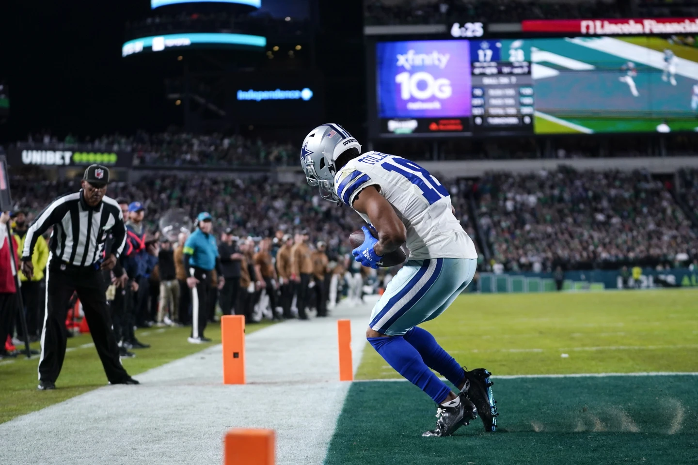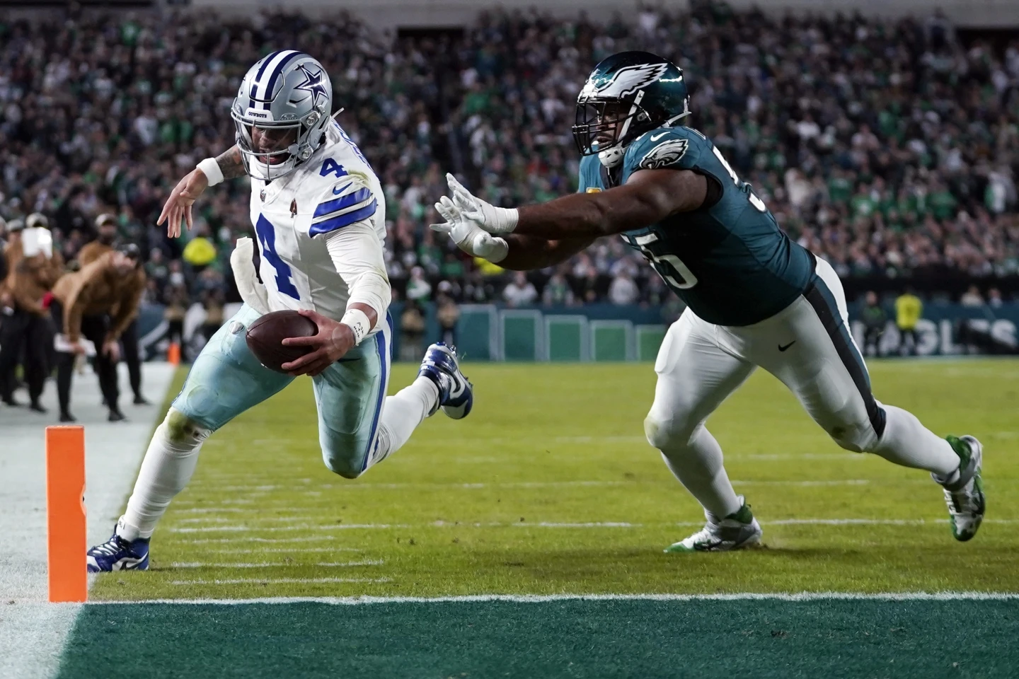 Philadelphia’s defense took it from there. Eagles linebacker Zach Cunningham prevented a score and flipped Prescott to the 1-yard line. On fourth down, Prescott’s pass to tight end Luke Schoonmaker was initially called a touchdown. But a replay review showed Schoonmaker’s left knee was down on about the inch line and the TD was overturned.
