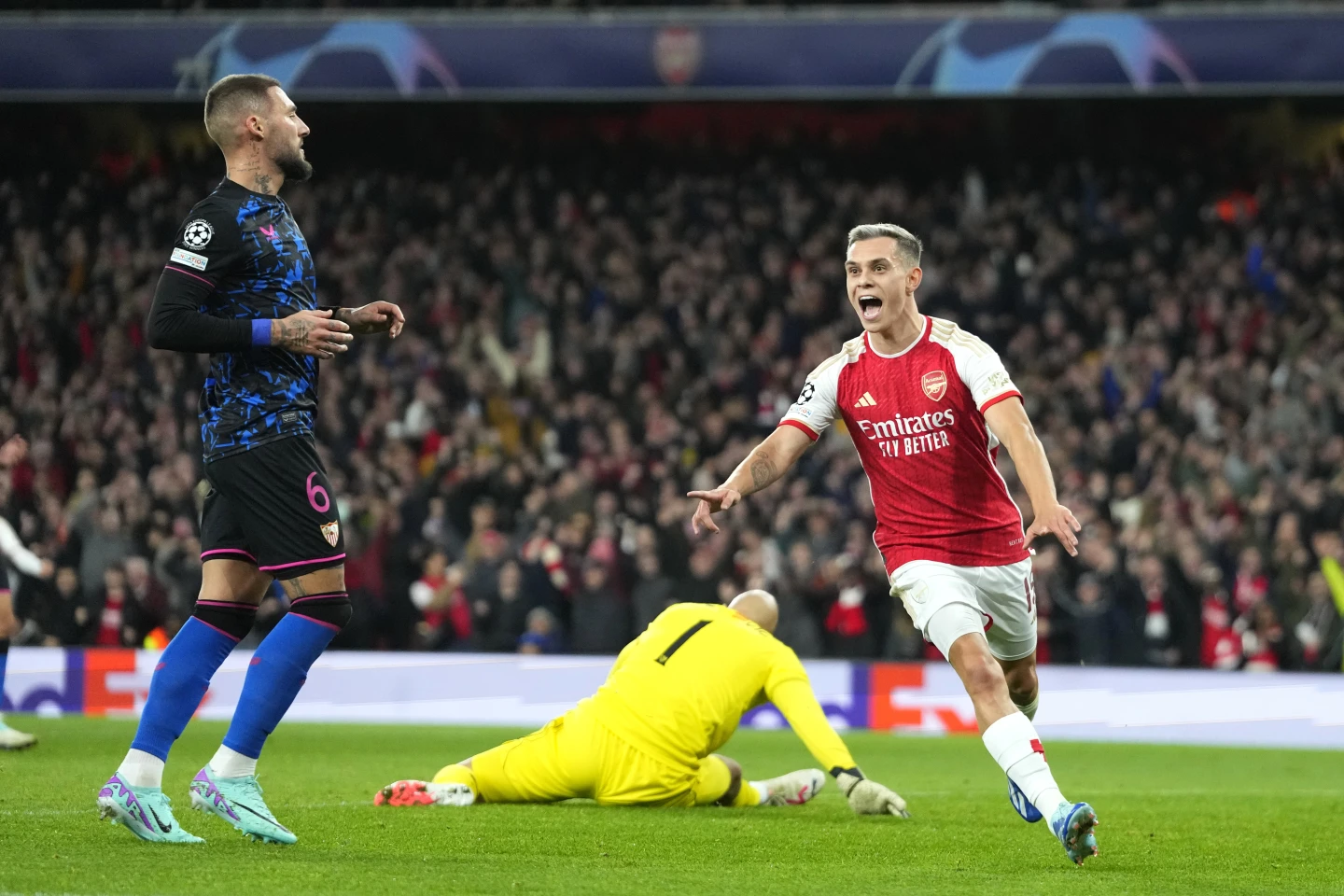 Arsenal took a four-point lead in Group B by comfortably beating Sevilla 2-0 while PSV Eindhoven rose from last place to second with its first win, 1-0 at home to Lens.