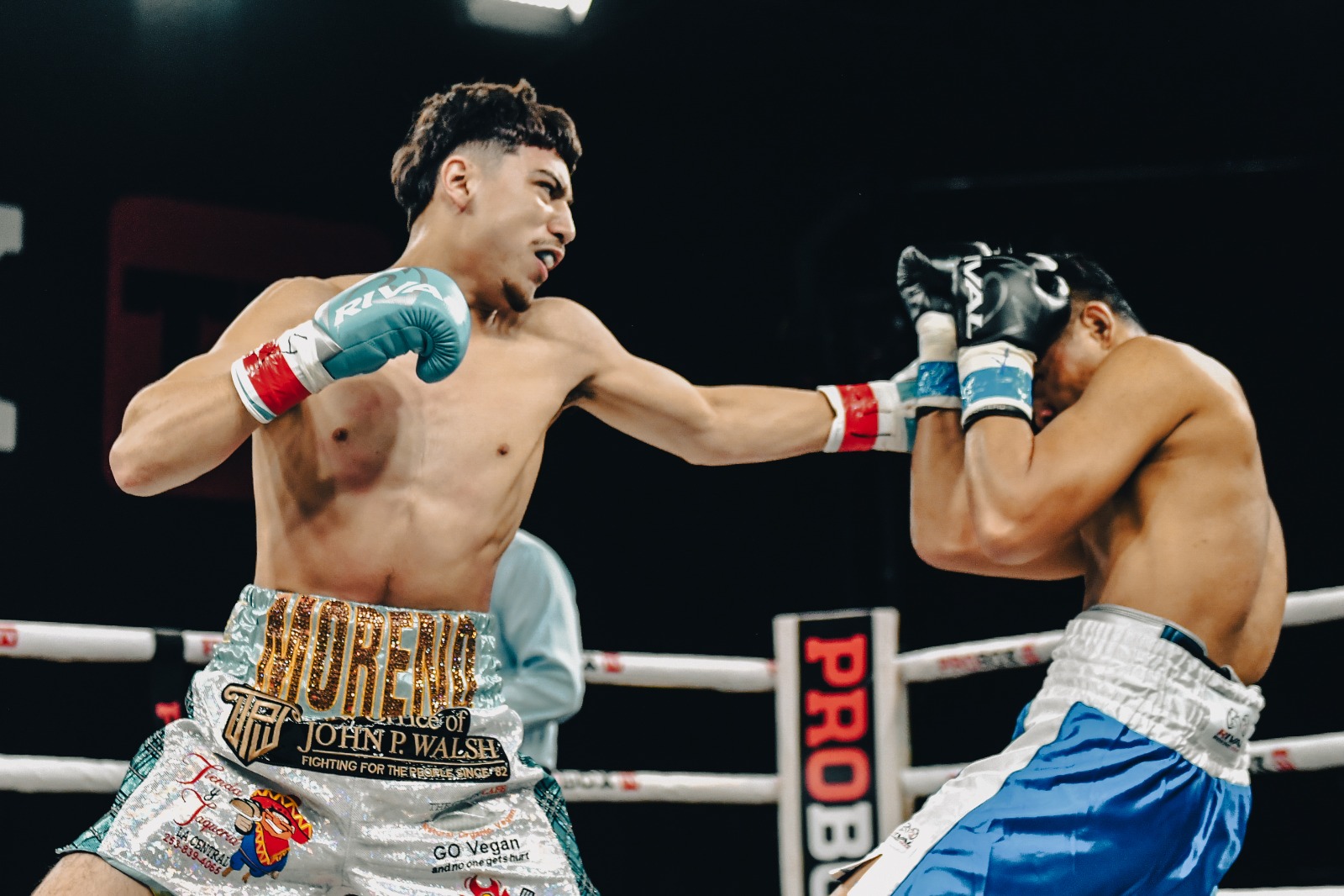 Moreno jumped out of the stool to start the second round, and the 18-year-old started to pump that left jab just outside mid-range. Once he began to get his rhythm, Moreno increased the pressure with an overhand right to the head and right hook to the body.