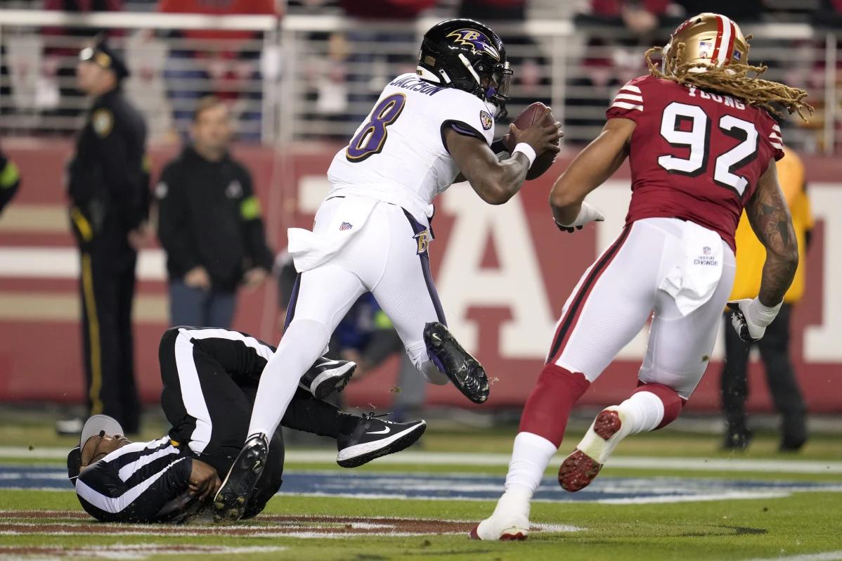 Jackson had help from his defense, which gave him a few short fields, and when Baltimore had the ball, he was the marvelous. The Ravens’ running game has had better days, and dealing with San Francisco’s pass rush wasn’t easy. But Jackson looked comfortable throughout — except when an official fell in front of him in the end zone, causing him to go down and take an intentional grounding penalty for an early safety.