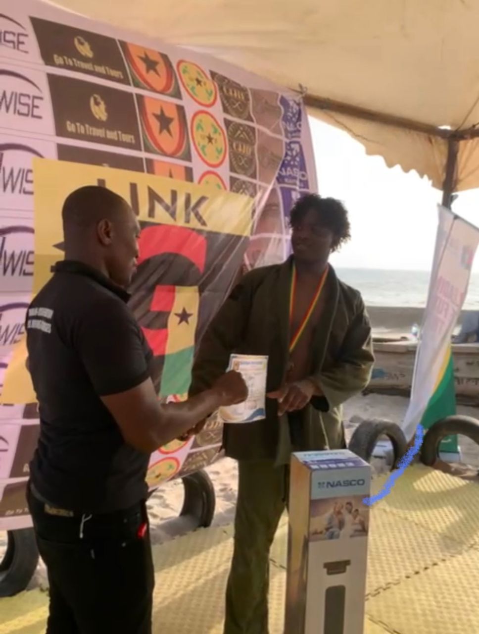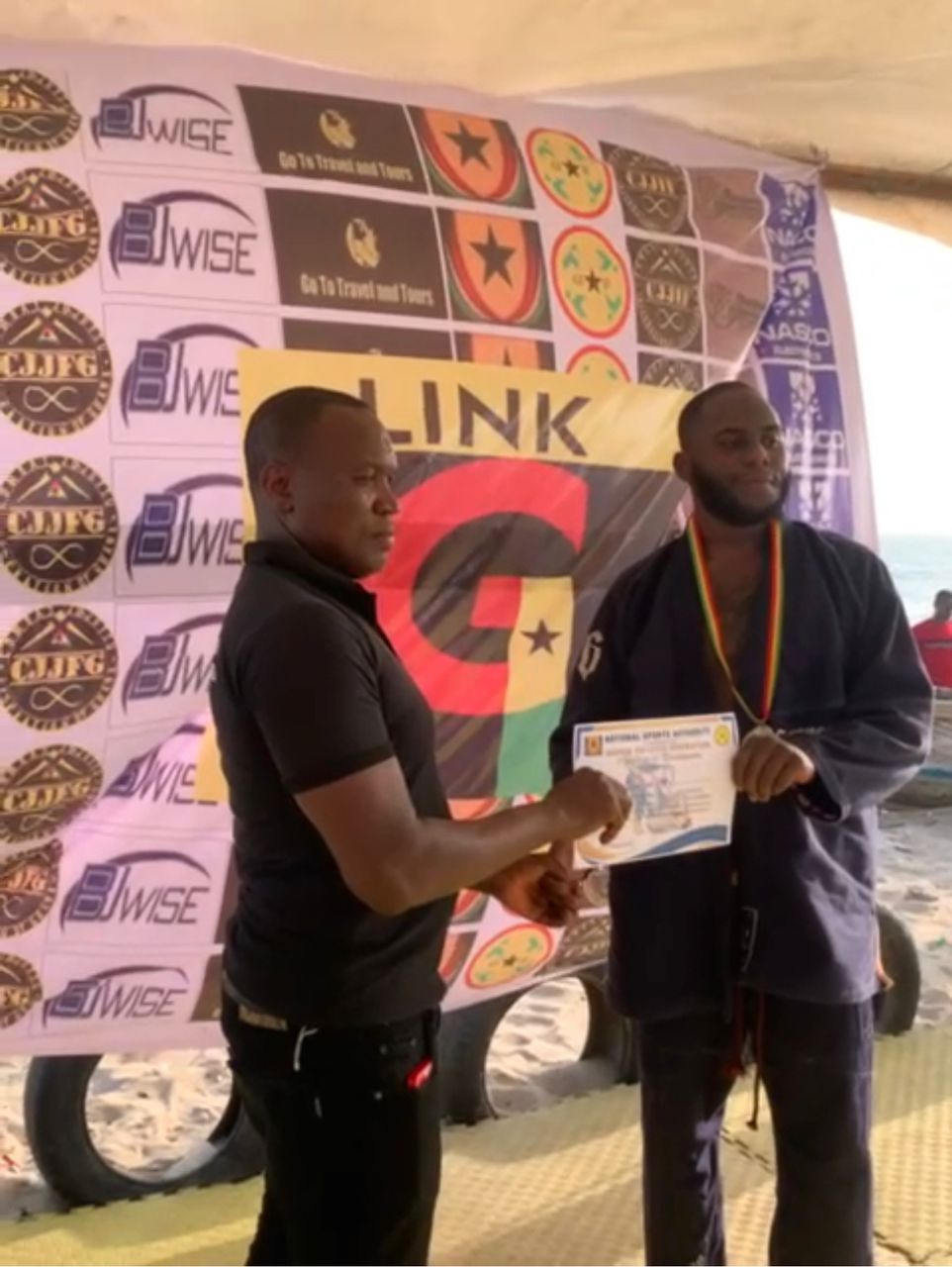 Danso Adjei Jnr, son of Dr. Nick Danso Adjei, Executive Chairman of Ghana Link Network Services Ltd who lives in the US where he is vested in the sport, took advantage of spending the Christmas holidays in Ghana to compete at the 2023 Open Jiu Jutsu and Combat Jiu Jutsu Beach Championship staged by the GJJF in conjunction with the National Sports Authority (NSA).