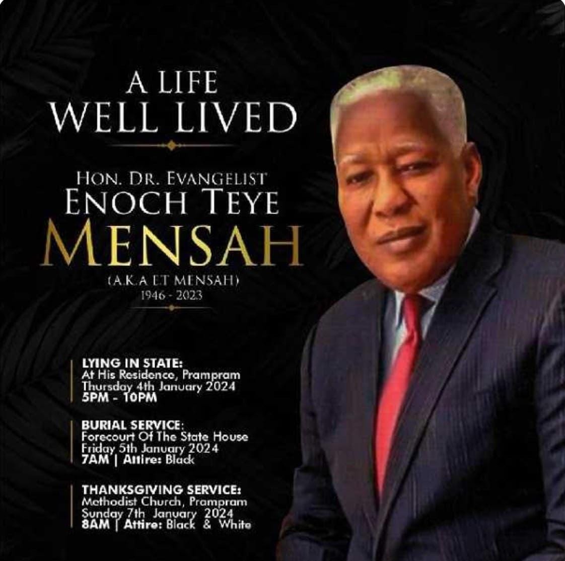 Enoch Teye Mensah was also a Minister for Education and a Member of Parliament for the people of Ningo Prampram from January 1997 until January 2017.