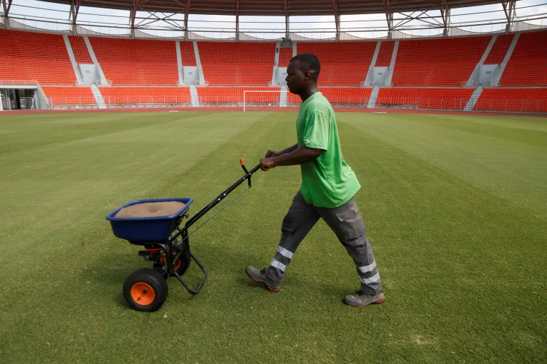 A worker spreads fertiliser on the lawn of the Bouake stadium, ahead of the 34th edition of the African Cup of Nations [AFCON] scheduled to take place from January 13 to February 11, 2024, in Bouake, Ivory Coast December 7, 2023 [Luc Gnago/Reuters]