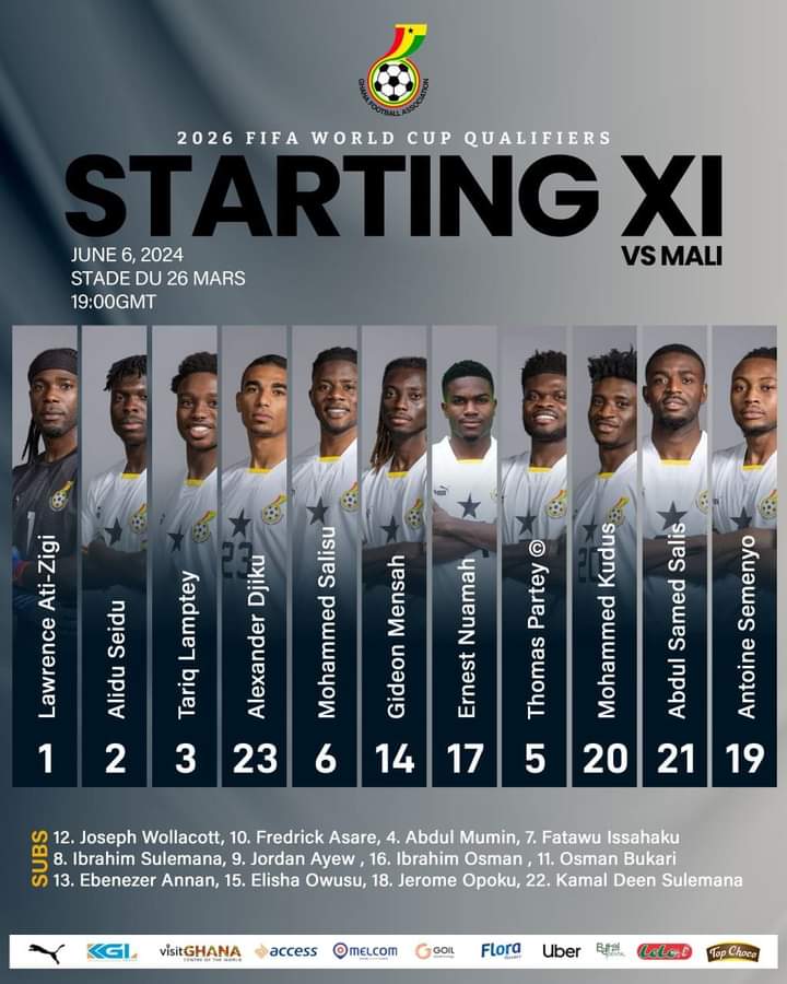 Otto Addo has named Arsenal midfielder Thomas Partey, France based Ernest Nuamah and Mohammed Kudus in his starting lineup for the crucial 2026 FIFA World Cup qualifier against Mali.