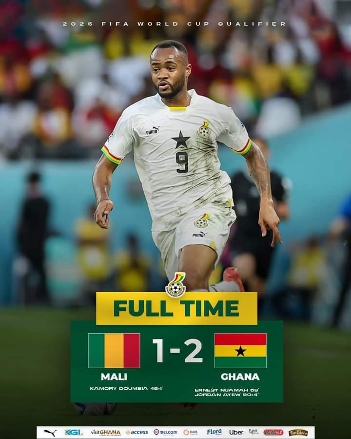 Jordan Ayew’s 94th minute goal saw Ghana clinch a nail-biting 2-1 victory against Mali in their FIFA World Cup African Qualifiers Group I game played at the Stade du 26 Mars in Bamako.